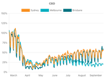 However, the continued disruption to domestic air travel across Australia and a ban on international travel means that high value OOH inventory in and around airports is languishing. And there is more uncertainty about how activity will return in CBDs. Current activity levels in Sydney and Brisbane CBDs are back to roughly half of their pre-COVID levels. This stems from increased wariness about using public transport and the suitability of many white-collar CBD jobs to be performed remotely.