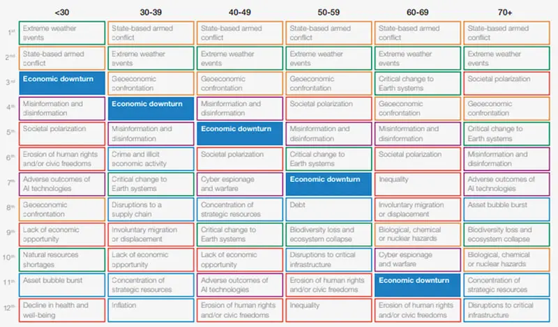 Present bias is the tendency for people to trade off potentially larger, long-term future rewards for more certain but typically lesser immediate or present rewards. However, what presently matters to you depends on a range of individual factors. For example, where you sit in life matters, with the World Economic Forum’s 2025 Global Risks Report suggesting a global generational divide between different age groups when it comes to the importance of different global issues. This analysis suggests that people worldwide under 30 years old rank economic downturn as their third biggest global concern. However, this priority drops the older we get, eventually not even in the top 12 priorities for people aged over 70.